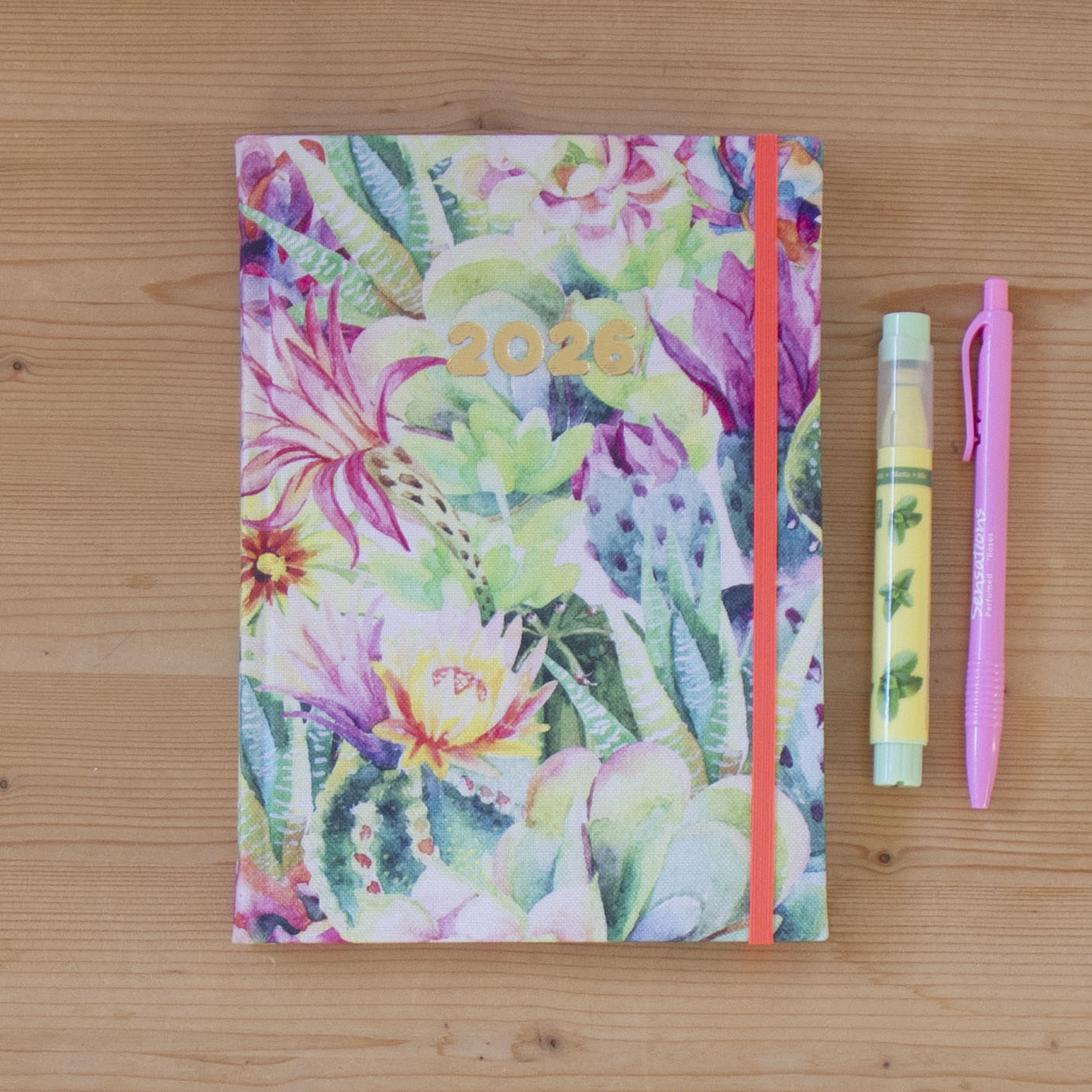 Agenda Semanal Capa dura em tecido, com elástico e gravação 2026 em dourado e baixo relevo, tamanho A5