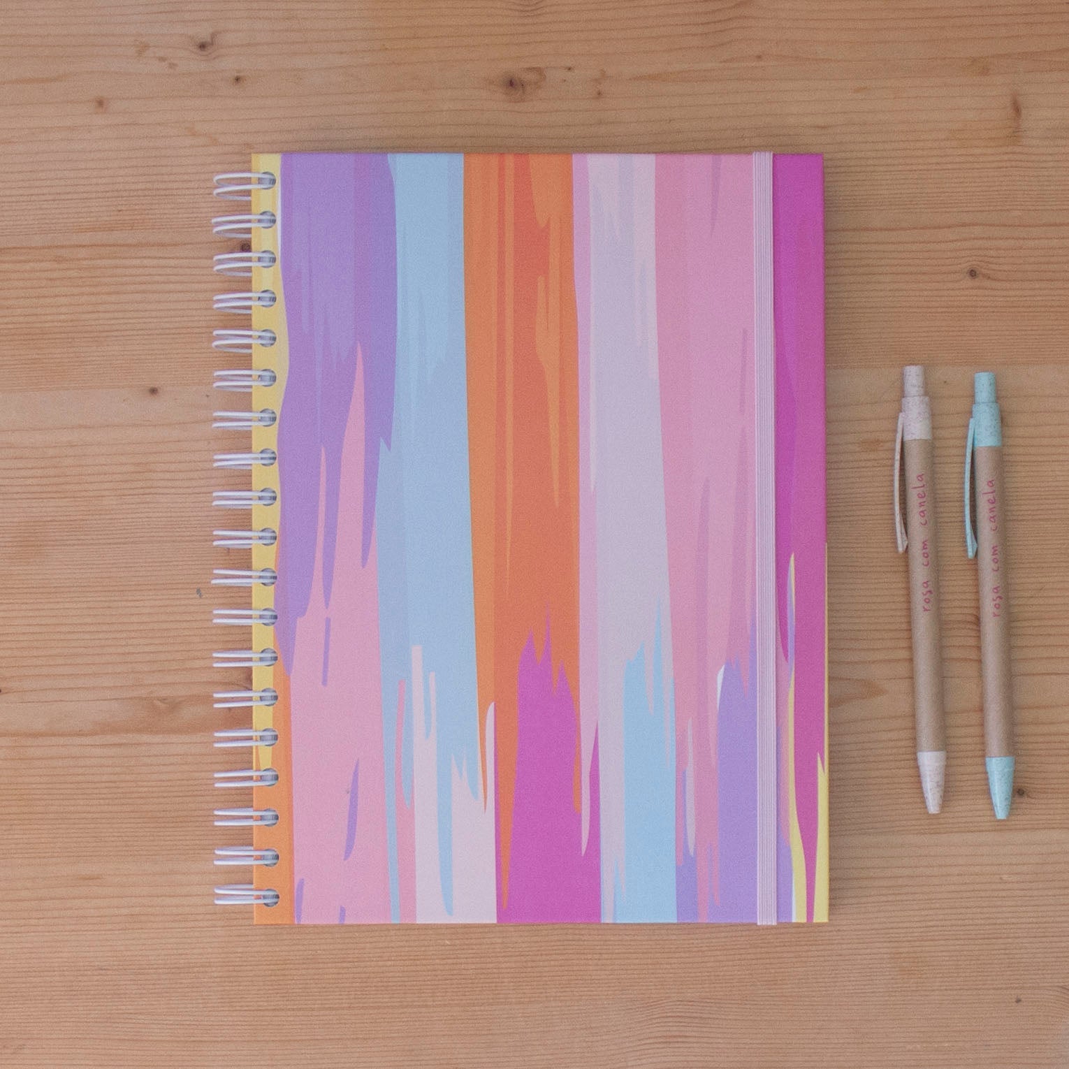 Caderno com argolas na lateral e capa dura impressa a cores, com elástico a combinar.