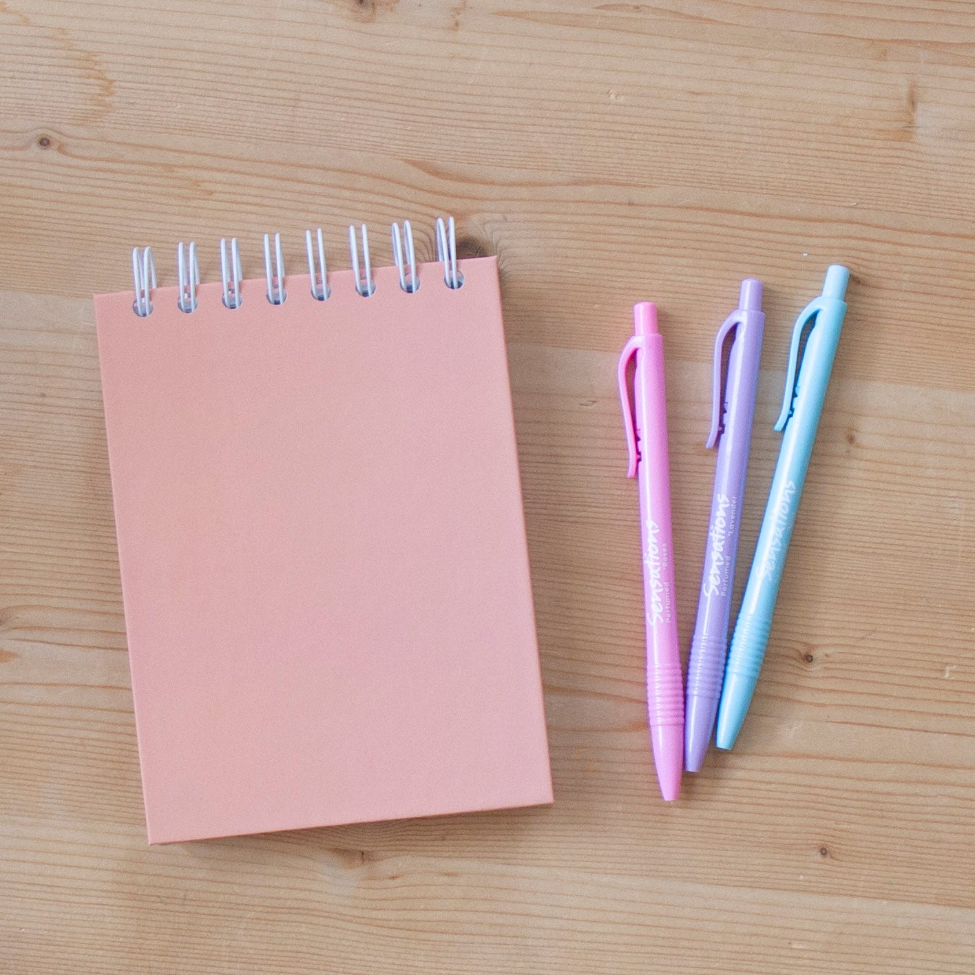 Caderno tamanho A6, com argolas no topo.