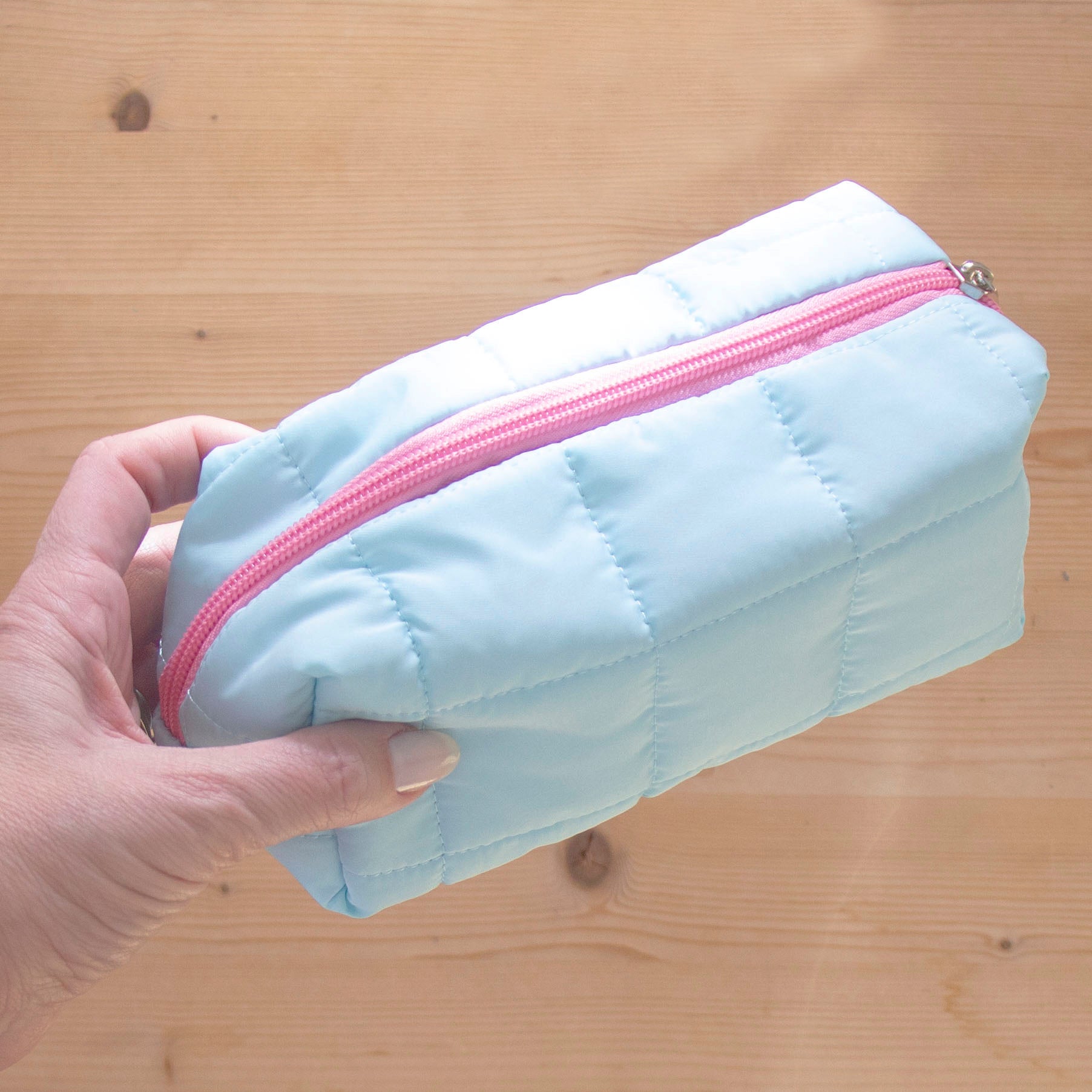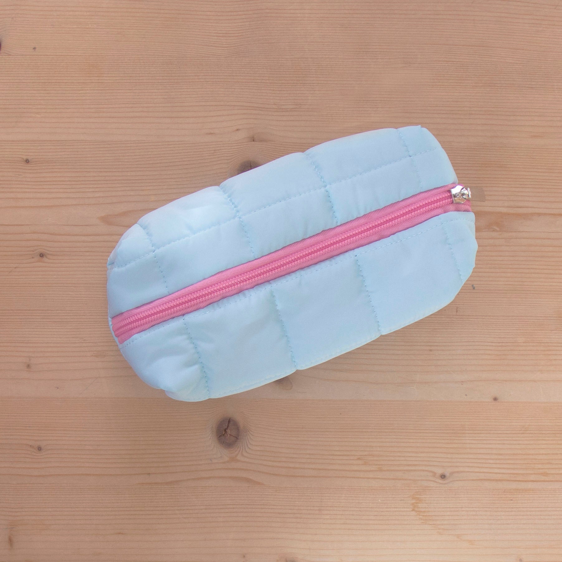 Estojo em tecido, almofadado e em cores pastel.