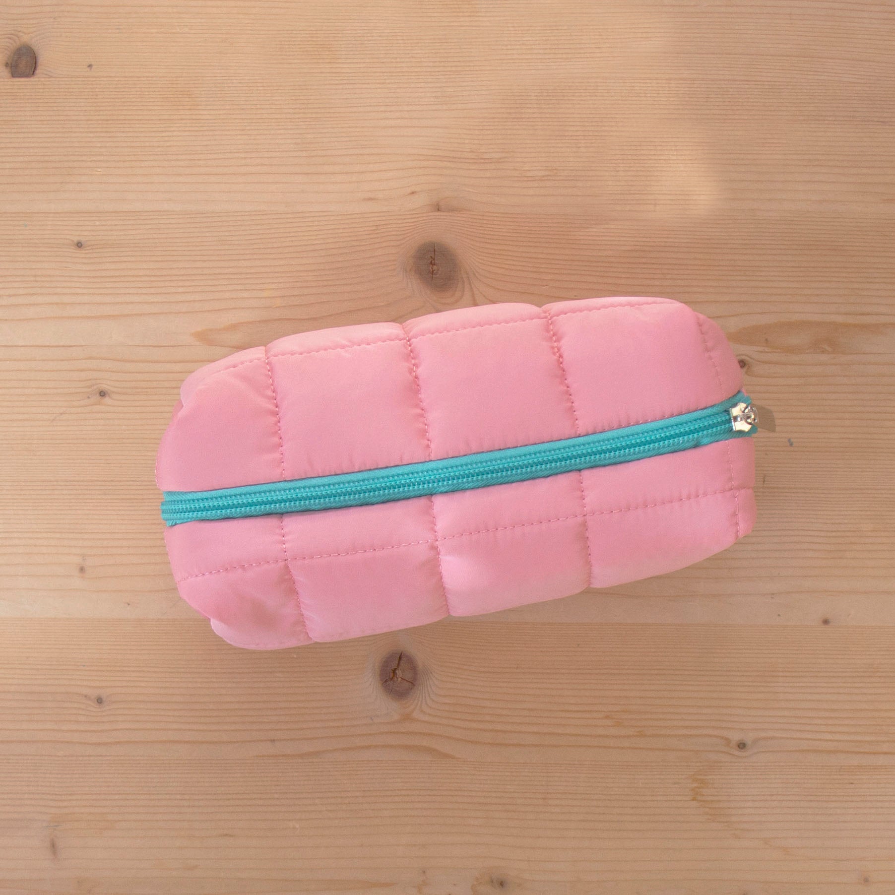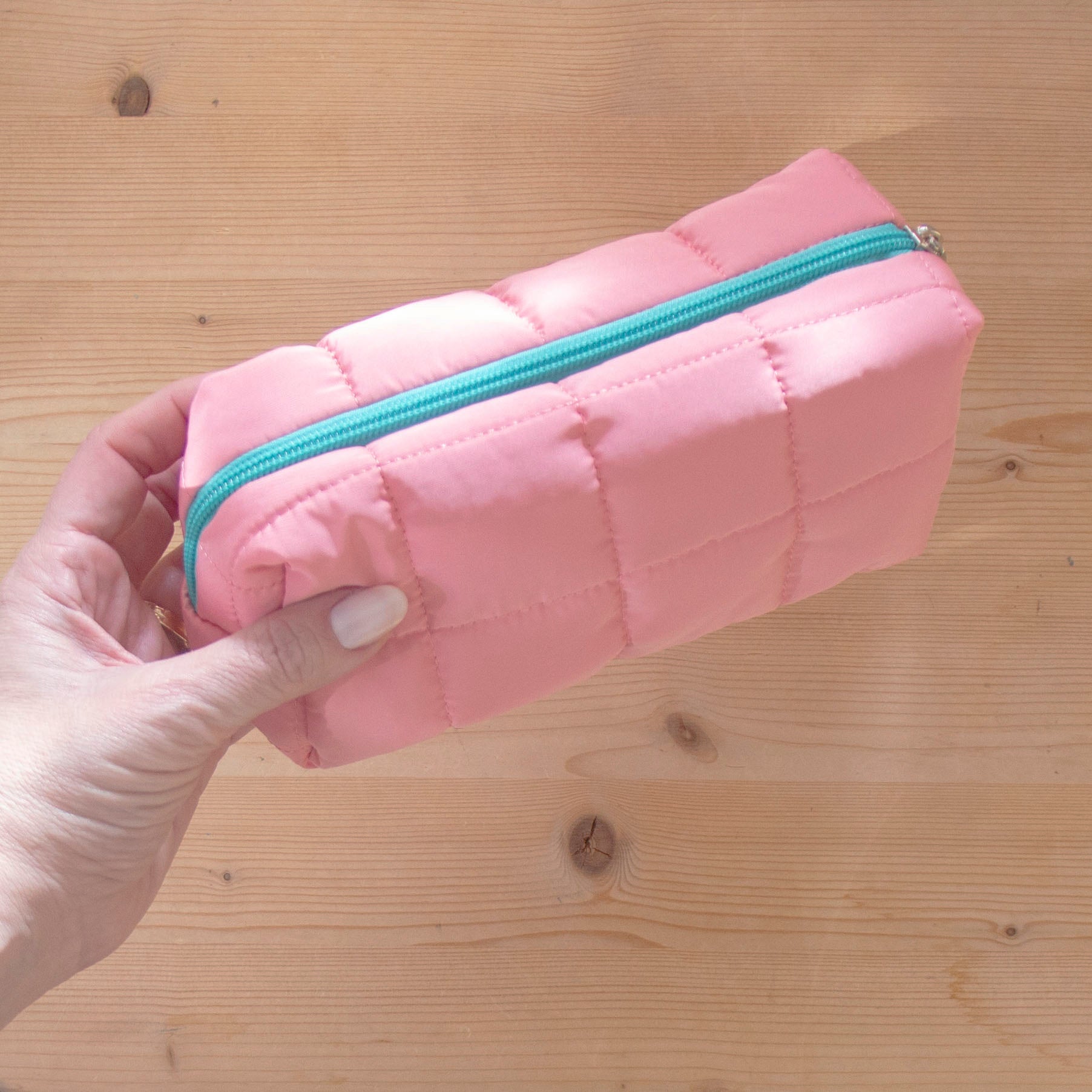 Estojo em tecido, almofadado e em cores pastel.