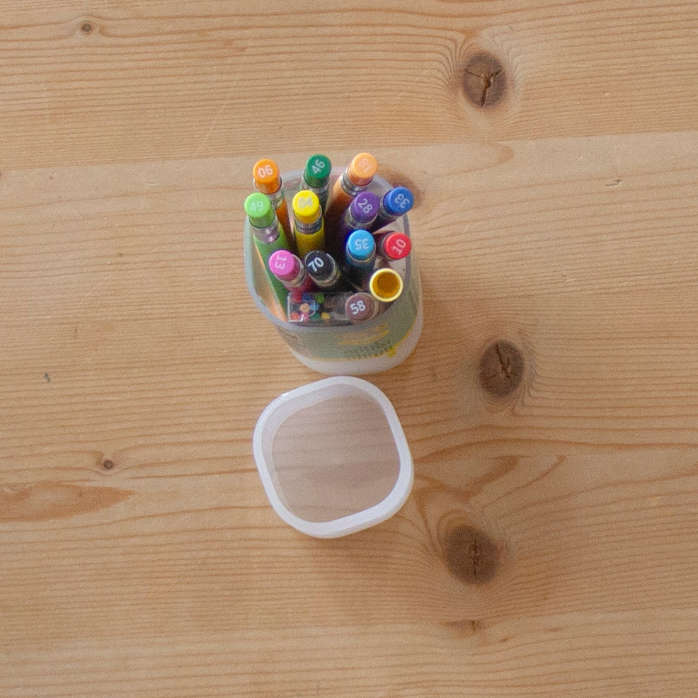 Corpo em plástico, 12 reposições de minas, e um afia com recipiente.