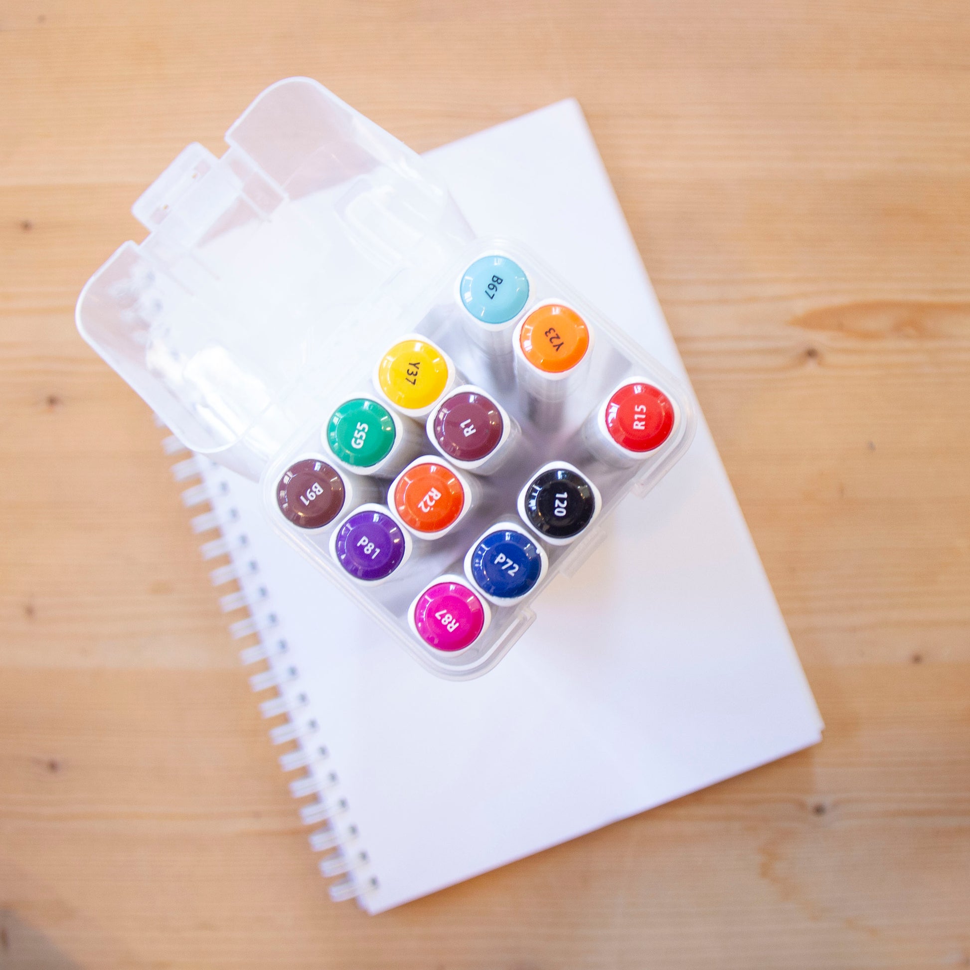 Caixa transparente com 12 marcadores/sublinhadores com ponta duple: fina e grossa.