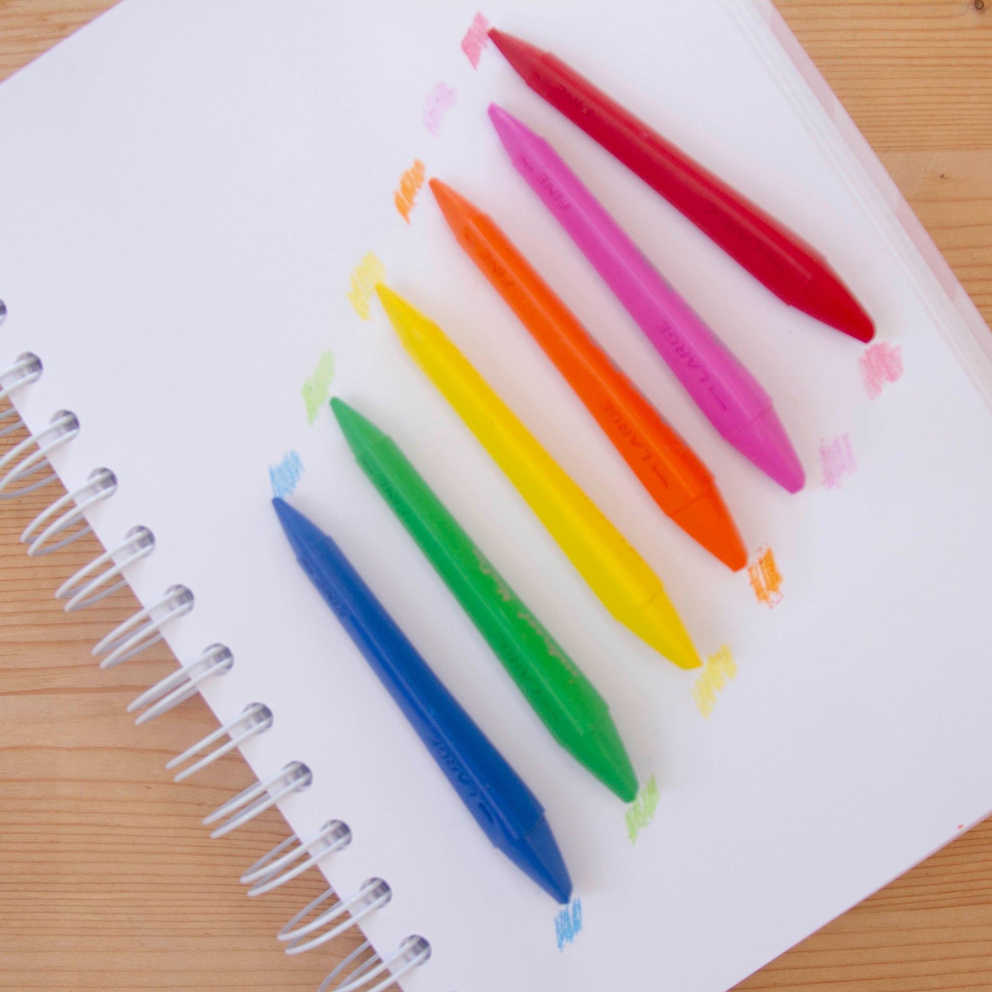 e 6 Lápis de cor em cera em com ponta dupla, e tamanho mini.
