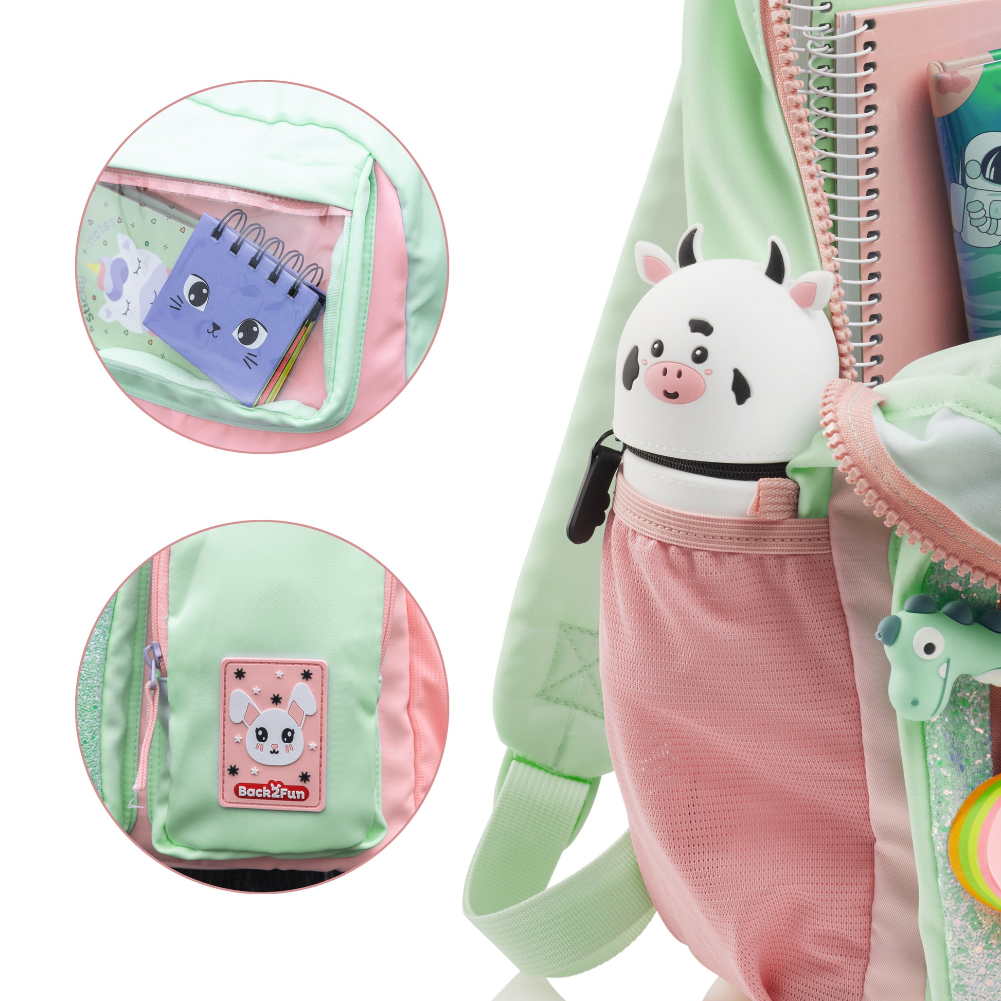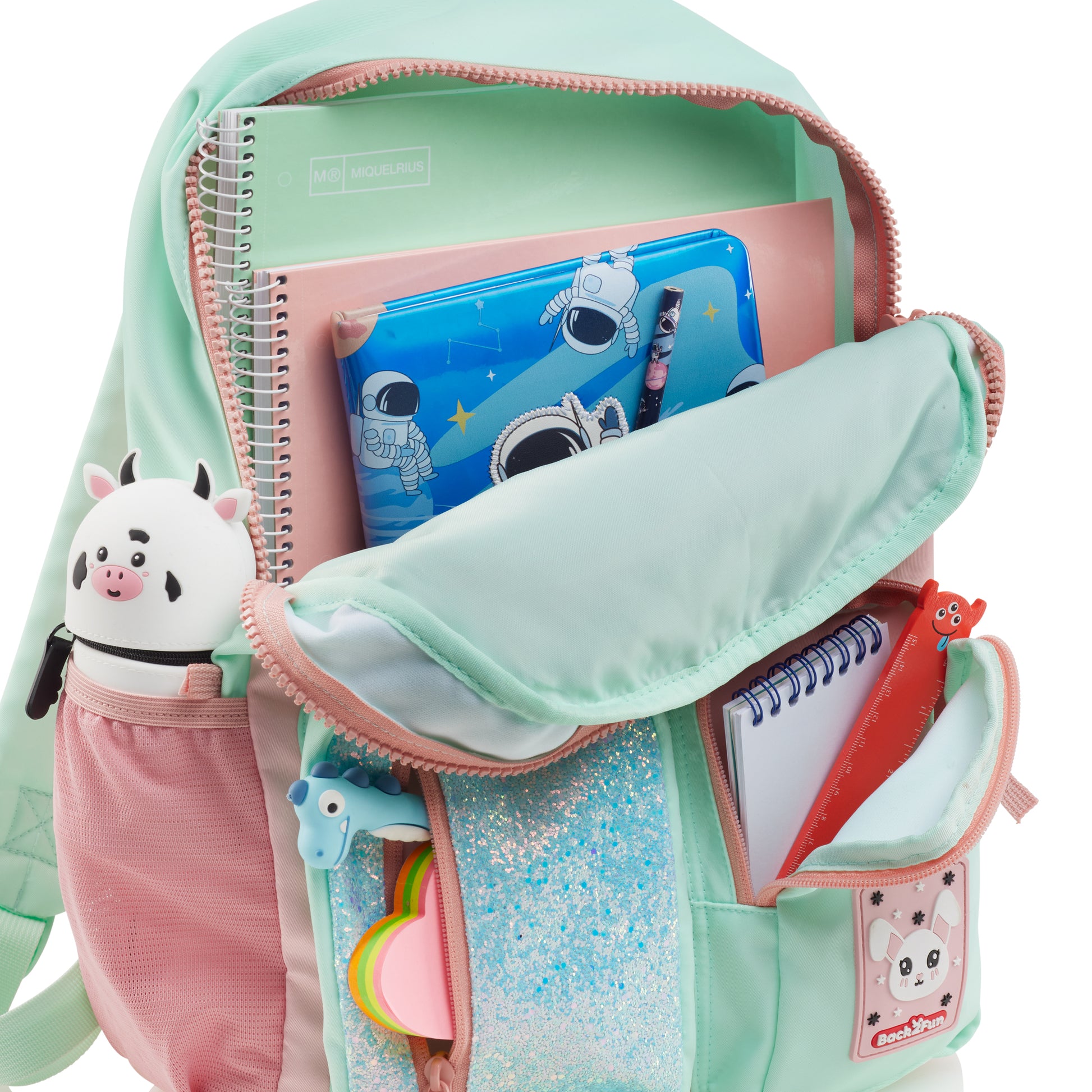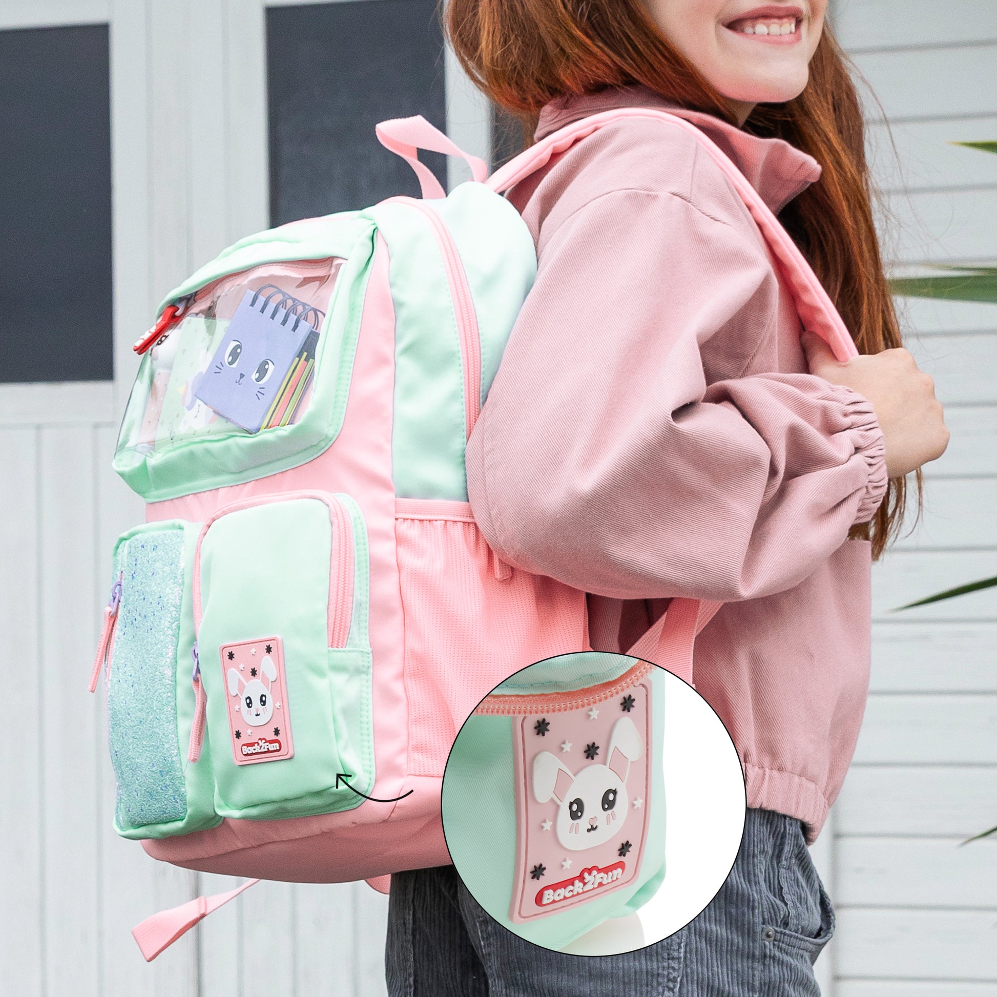 Mochila em tecido, com 2 bolsos laterais e uma bolsinha com janela e com fecho