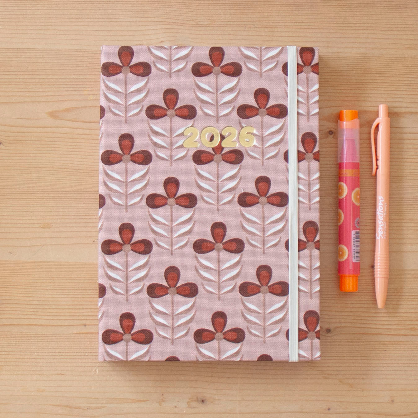 Agenda Diária Capa dura em tecido, com elástico e gravação 2026 em dourado e baixo relevo, tamanho A5