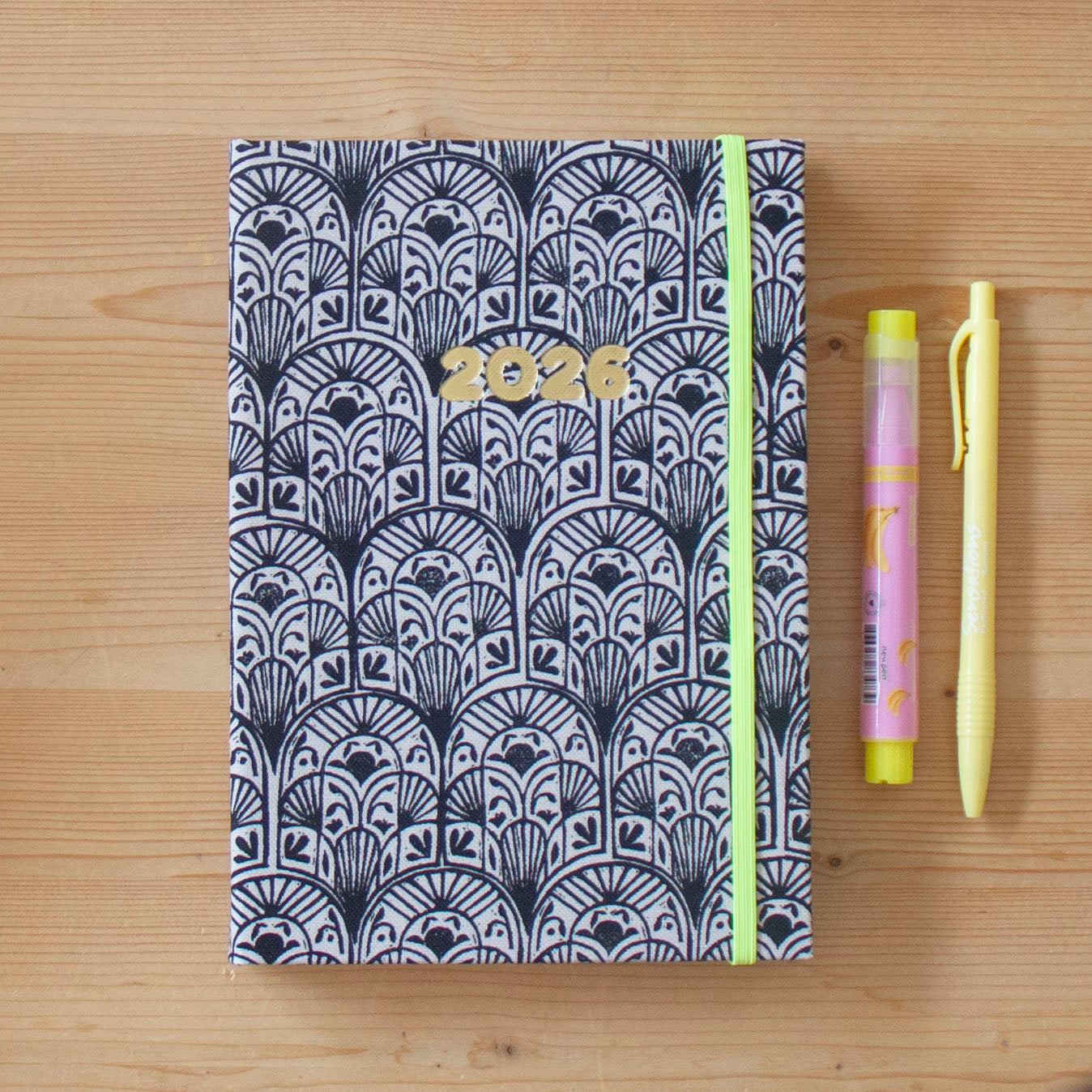 Agenda Diária Capa dura em tecido, com elástico e gravação 2026 em dourado e baixo relevo, tamanho A5