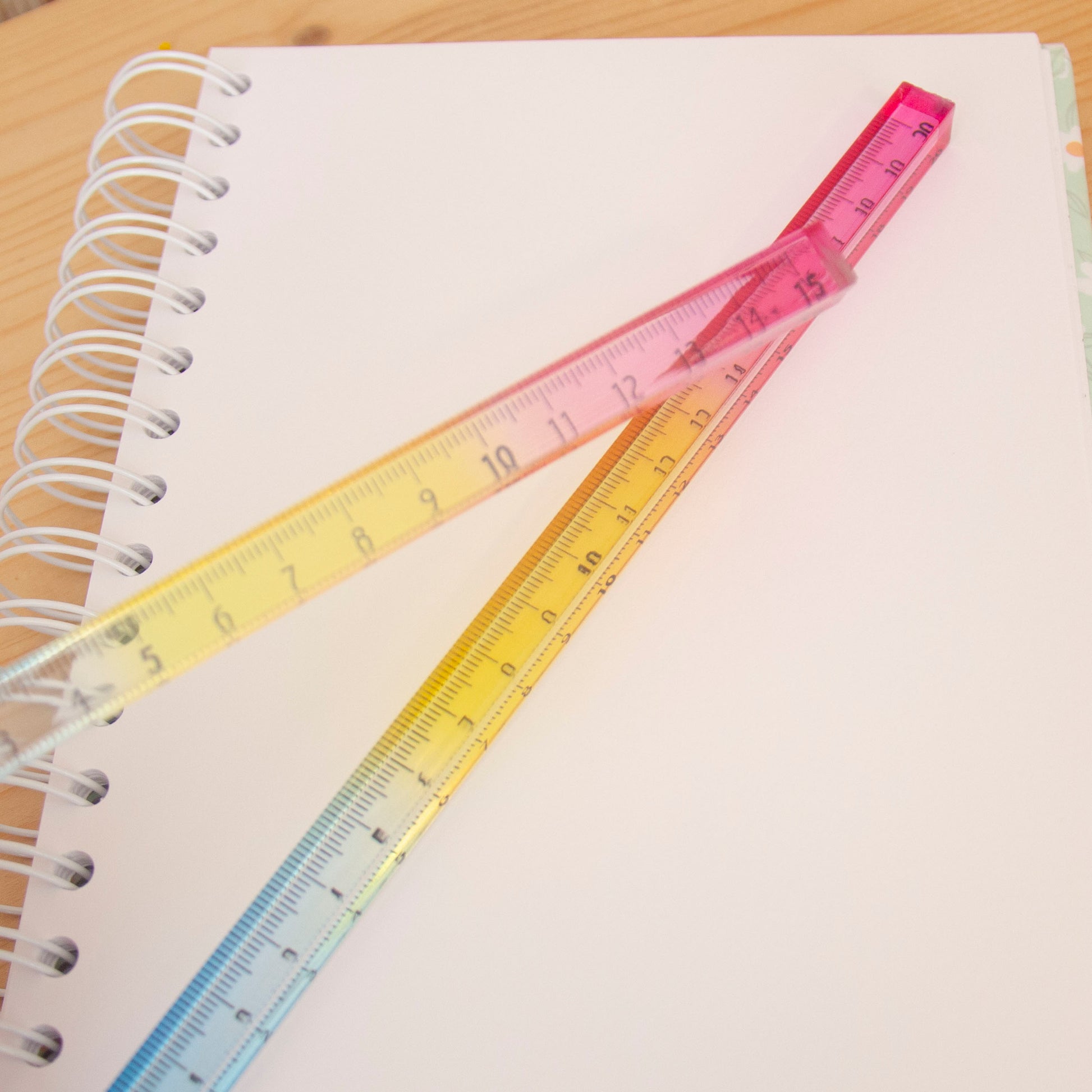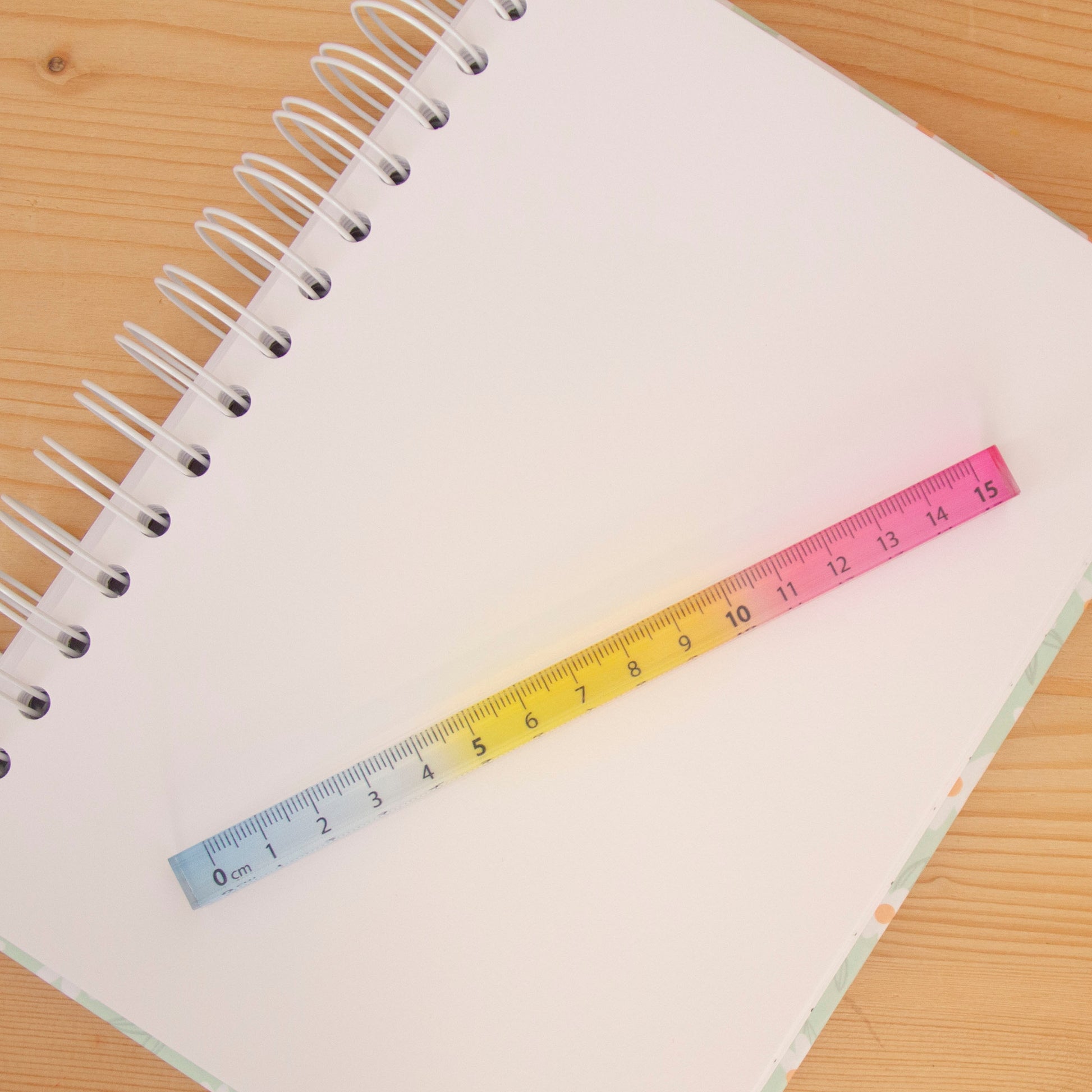 Régua 15 cm, em plástico rígido e quadrada, em 3 D. Efeito arco-íris.